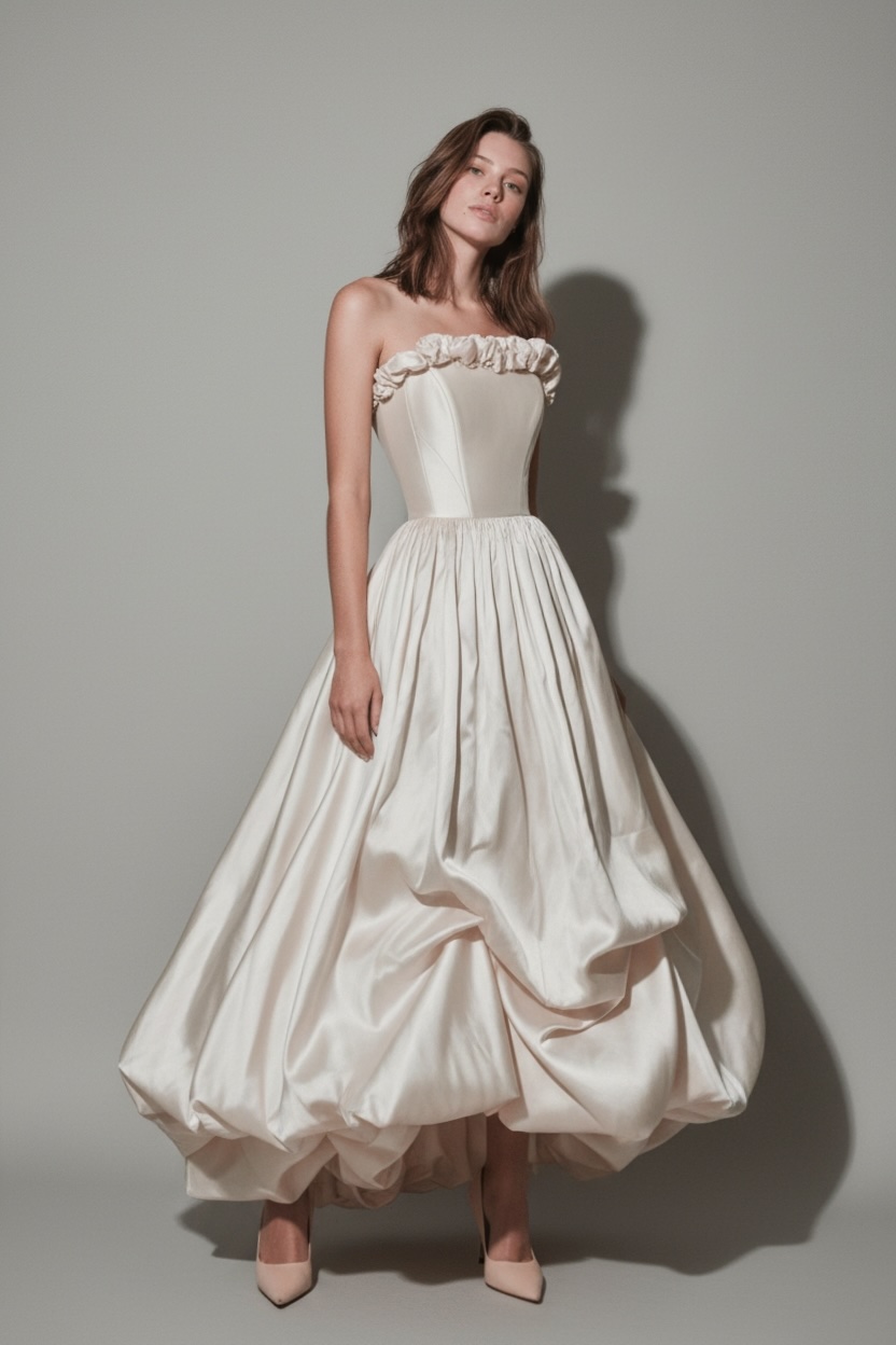 This strapless corset dress features a delicately ruffled neckline that frames the décolletage with romantic elegance. The fitted bodice flows into a sculptural, voluminous skirt with architectural draping, creating dramatic movement and couture presence. A refined yet expressive bridal design for modern ceremonies and statement bridal moments.