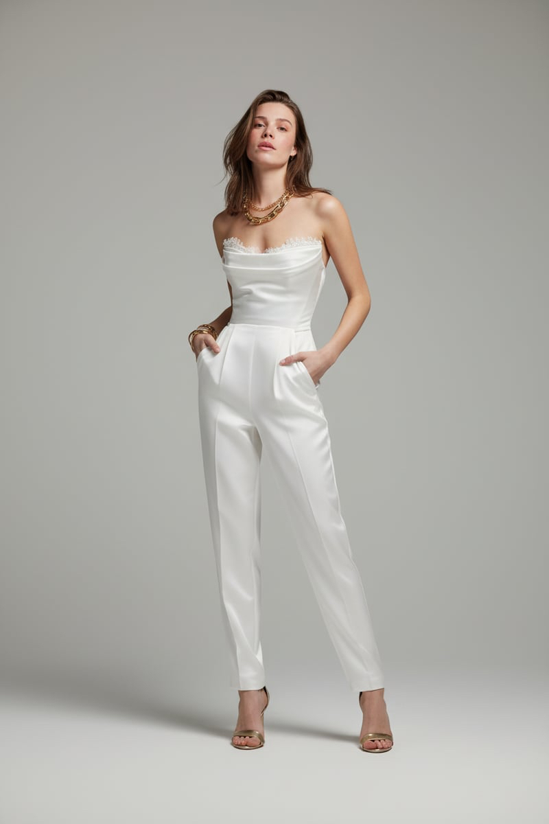 This strapless bridal jumpsuit features a softly draped bodice with delicate lace trim and tailored high-waisted trousers. Crafted for modern elegance, the fluid silhouette balances femininity and confidence, offering a refined alternative for contemporary ceremonies or after-party moments.