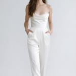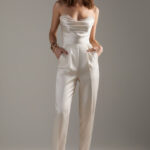 Yumuşak drapeli, dantel detaylı straplez üst kısmı ve yüksek bel, net kesimli pantolonu ile bu gelin tulumu modern bir zarafet sunar. Akışkan silueti feminen ve güçlü bir duruş yaratırken, çağdaş nikâhlar ve after-party görünümleri için sofistike bir alternatif oluşturur.