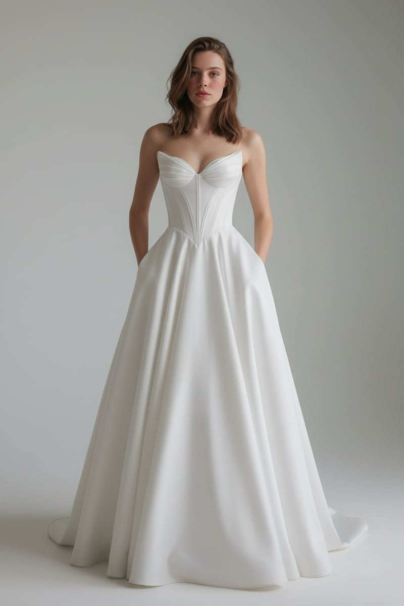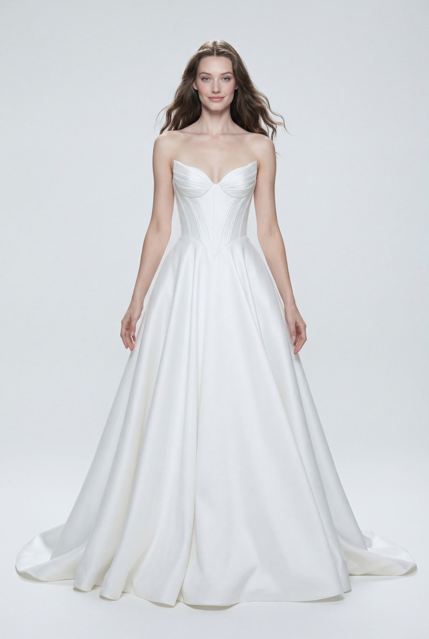 A refined bridal gown defined by a structured strapless corset that shapes the waist with architectural precision. The clean, voluminous skirt flows effortlessly from the fitted bodice, creating a timeless ball gown silhouette that balances modern minimalism with classic bridal elegance.