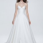 Bel hattını mimari bir netlikle vurgulayan straplez korse tasarımıyla öne çıkan bu gelinlik, korseden yumuşakça açılan hacimli eteğiyle zamansız bir balo silueti sunar. Modern sadelik ile klasik gelin şıklığını kusursuz bir dengede buluşturur.