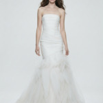 Vücudu zarifçe şekillendiren heykelsi straplez üst kısmıyla başlayan bu çarpıcı mermaid gelinlik, dramatik organze fırfırlı eteğiyle eterik bir hacim ve hareket kazandırır. Akıcı katmanlar modern sofistikelikle couture masalsılığını kusursuz bir dengede buluşturur.