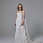 Bu zarif gelinlik, sade straplez yaka ve silueti uzatan düz kesimiyle modern bir şıklık sunar. Etek boyunca asimetrik şekilde yerleştirilen çiçek aplikeleri, yumuşak ve akıcı bir kuyrukla devam ederek tasarıma romantik bir dokunuş katar. Minimal çizgileri couture detaylarla buluşturan, sofistike gelinler için ideal bir seçenektir.