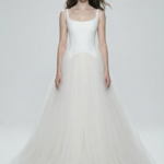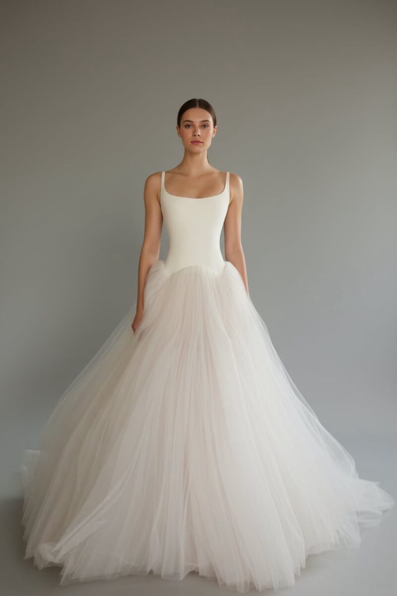 A clean, minimalist bodice with delicate straps creates a refined and modern silhouette, seamlessly flowing into a voluminous soft tulle skirt. Light, airy layers add romantic movement while maintaining understated elegance. Designed for brides who appreciate purity of form, balance, and timeless sophistication.