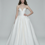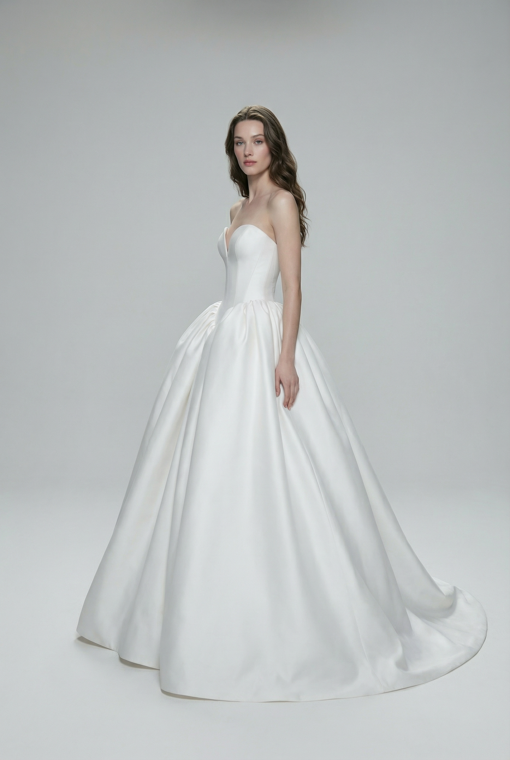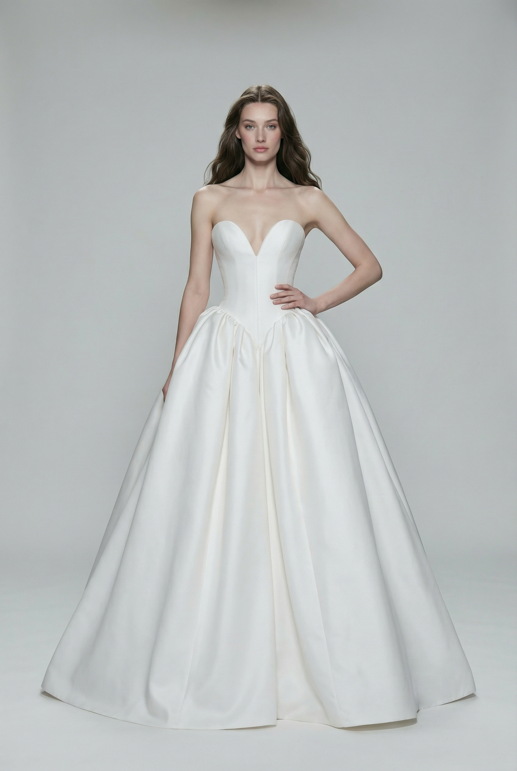 A clean, softly structured bodice with delicate strapless creates a modern and feminine silhouette, flowing into a full ball gown skirt with elegant volume. Crafted from smooth, structured satin, the design highlights purity of form and timeless balance. A refined bridal gown for brides who seek understated elegance with classic grandeur.