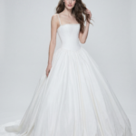 Korsaj gövdesi ve zarif askı detaylarıyla öne çıkan bu couture prenses gelinlik, hacimli ve toplanmış eteğiyle dramatik bir hareket etkisi yaratır. Minimal fakat ihtişamlı duruşuyla zamansız zarafeti modern çizgilerle buluşturur; güçlü, sade ve asil bir silüet sunar.