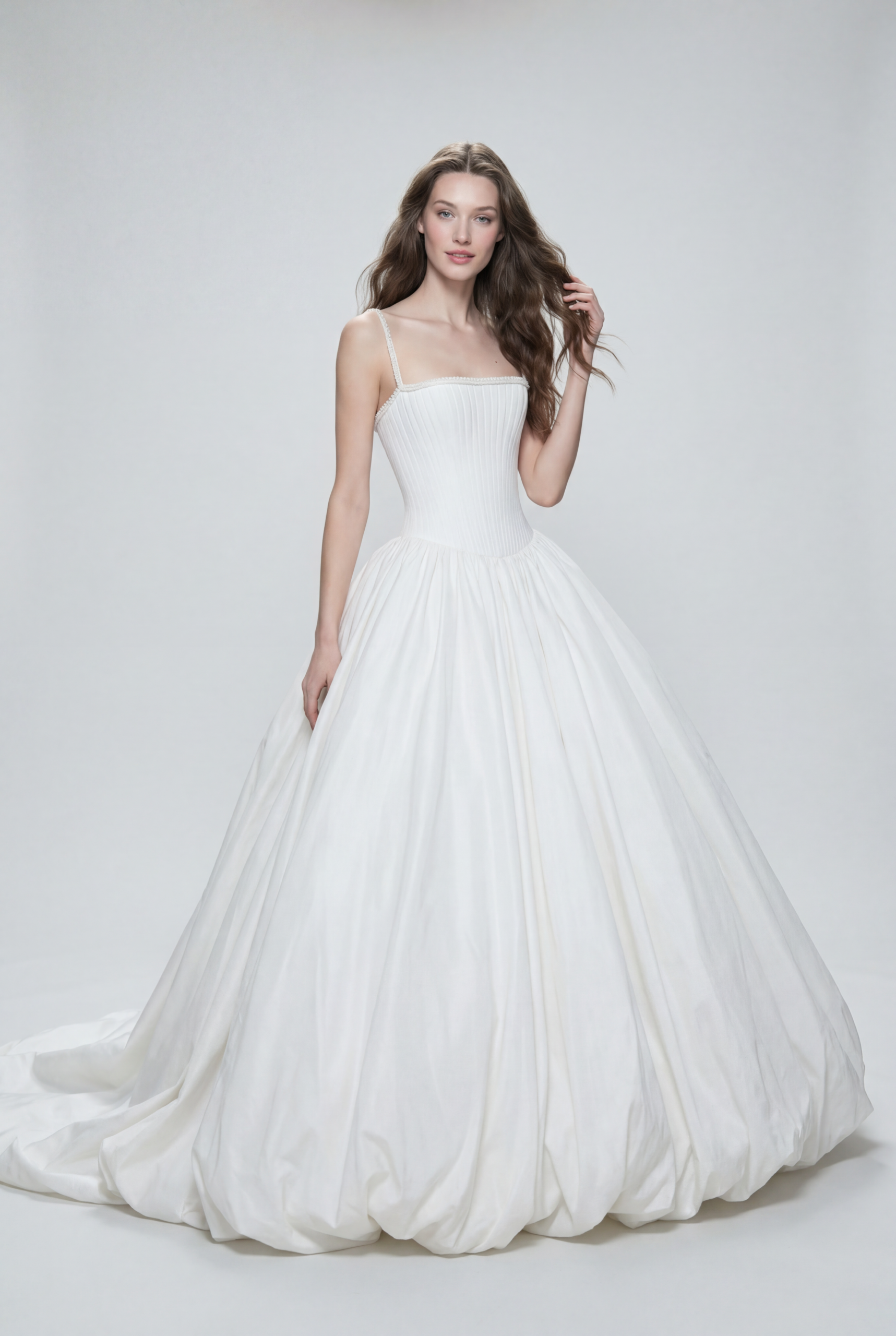 A refined couture ballgown defined by a sculpted corset bodice and delicately detailed straps. The voluminous gathered skirt creates dramatic movement while maintaining an elegant, minimal aesthetic. Timeless yet modern, this gown beautifully balances structure, softness, and regal sophistication.