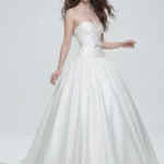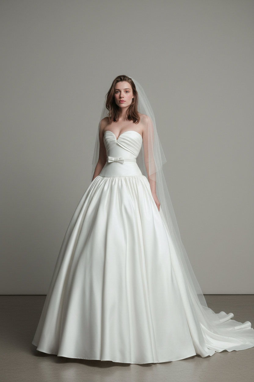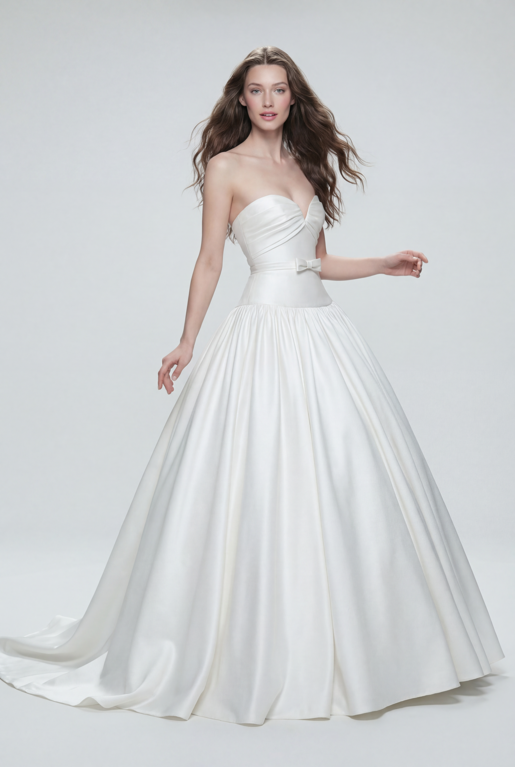 A timeless bridal silhouette featuring a softly draped sweetheart neckline and a delicately defined waist accented with a minimalist bow. The full A-line skirt flows with effortless elegance, creating a refined balance between classic romance and modern simplicity. Perfect for traditional ceremonies or understated luxury weddings.