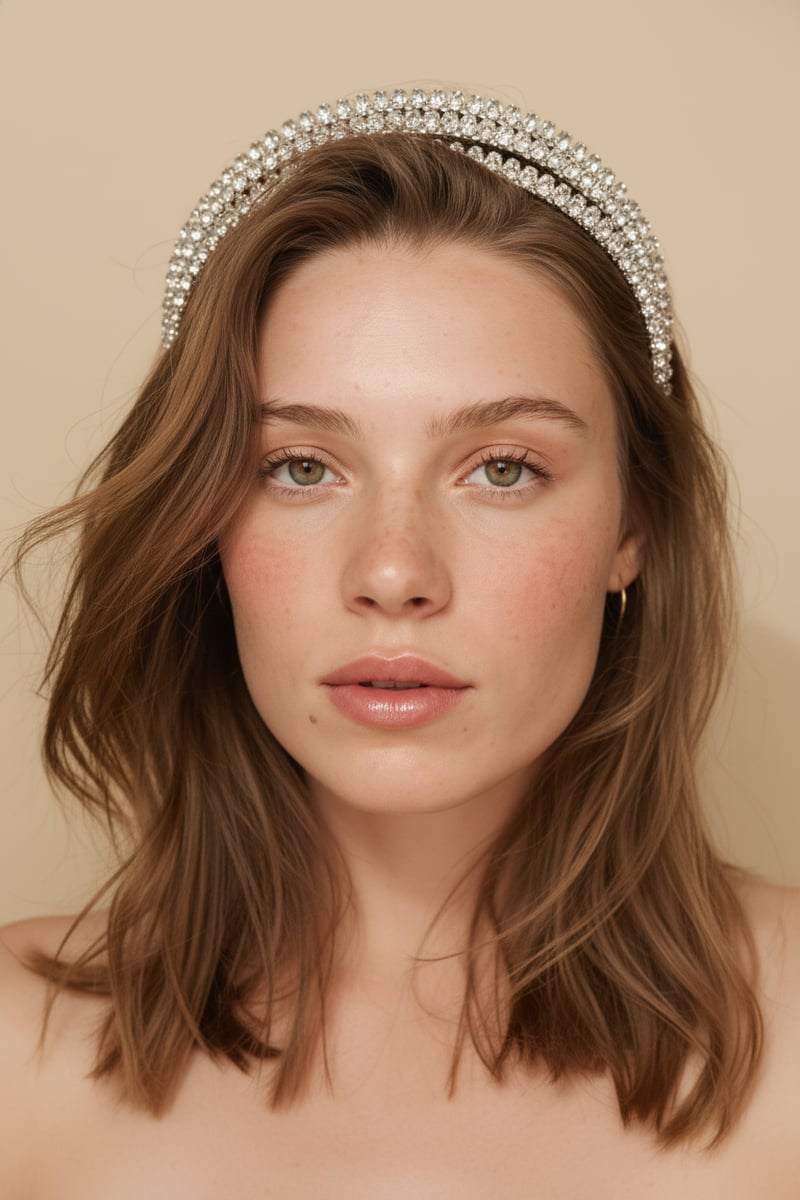 TRIVELLA is a three-layer crystal headpiece designed to create a striking, luminous halo effect. Crafted with rows of sparkling crystals, it adds a modern, elevated glamour to bridal and evening looks. Lightweight yet impactful, TRIVELLA is perfect for brides seeking a bold, luxurious statement.