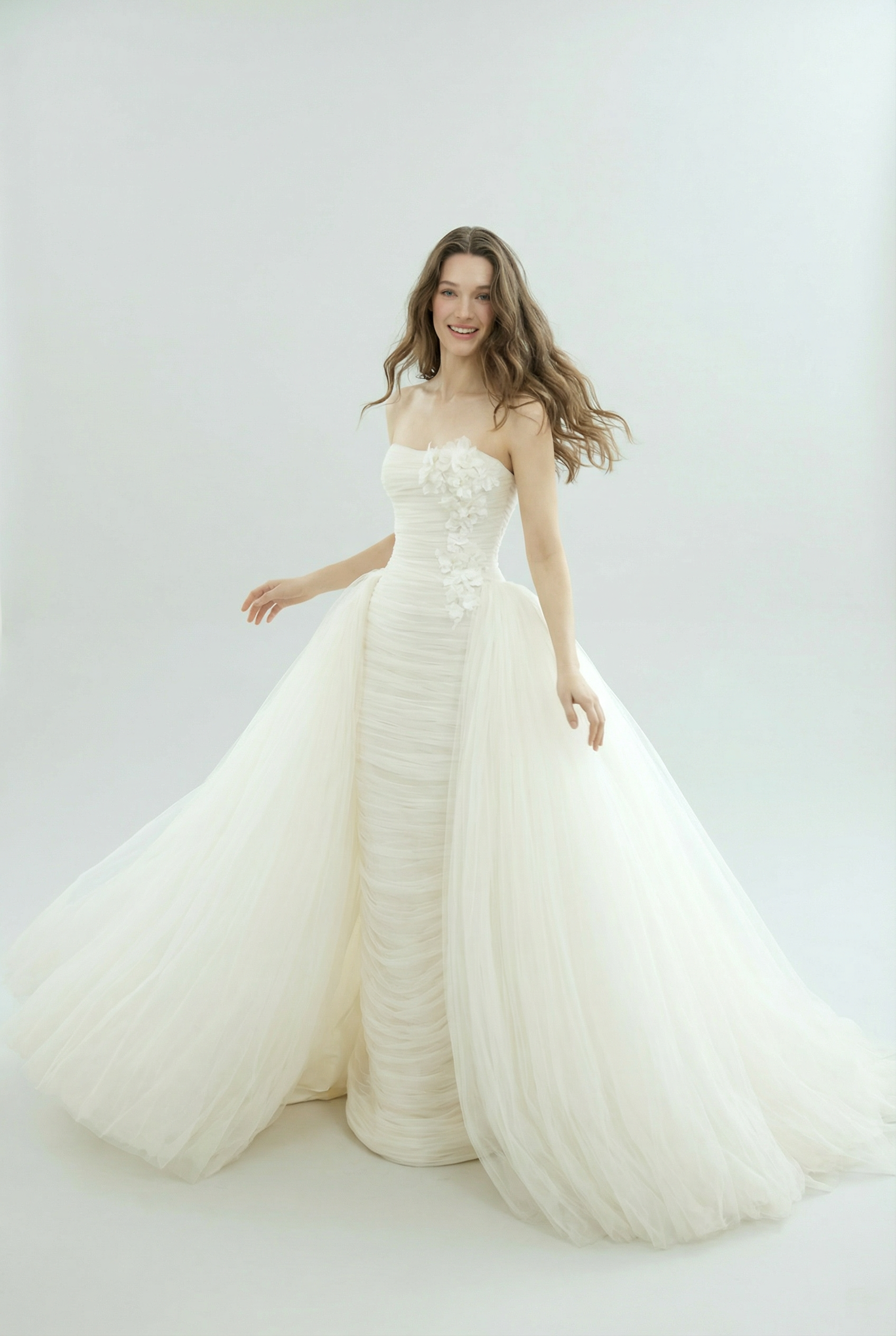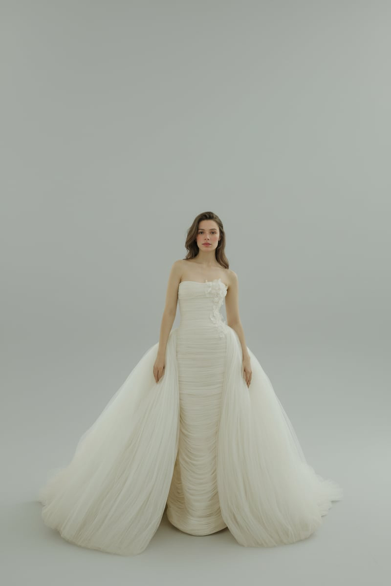 A softly draped strapless bodice shapes the silhouette with refined elegance, flowing into a slim column skirt. The look is completed with a voluminous detachable tulle overskirt, adding dramatic contrast and airy movement. A versatile bridal design that transitions effortlessly from ceremony grandeur to modern minimalism.