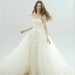 Yumuşak drapeli straplez korse, silueti zarif bir hassasiyetle şekillendirerek ince bir düz etekle tamamlanır. Hacimli ve çıkarılabilir tül overskirt detayı, tasarıma dramatik bir etki ve hafif bir hareket kazandırır. Törenden davete kolayca uyum sağlayan, modern ve çok yönlü bir gelinlik tasarımıdır.