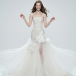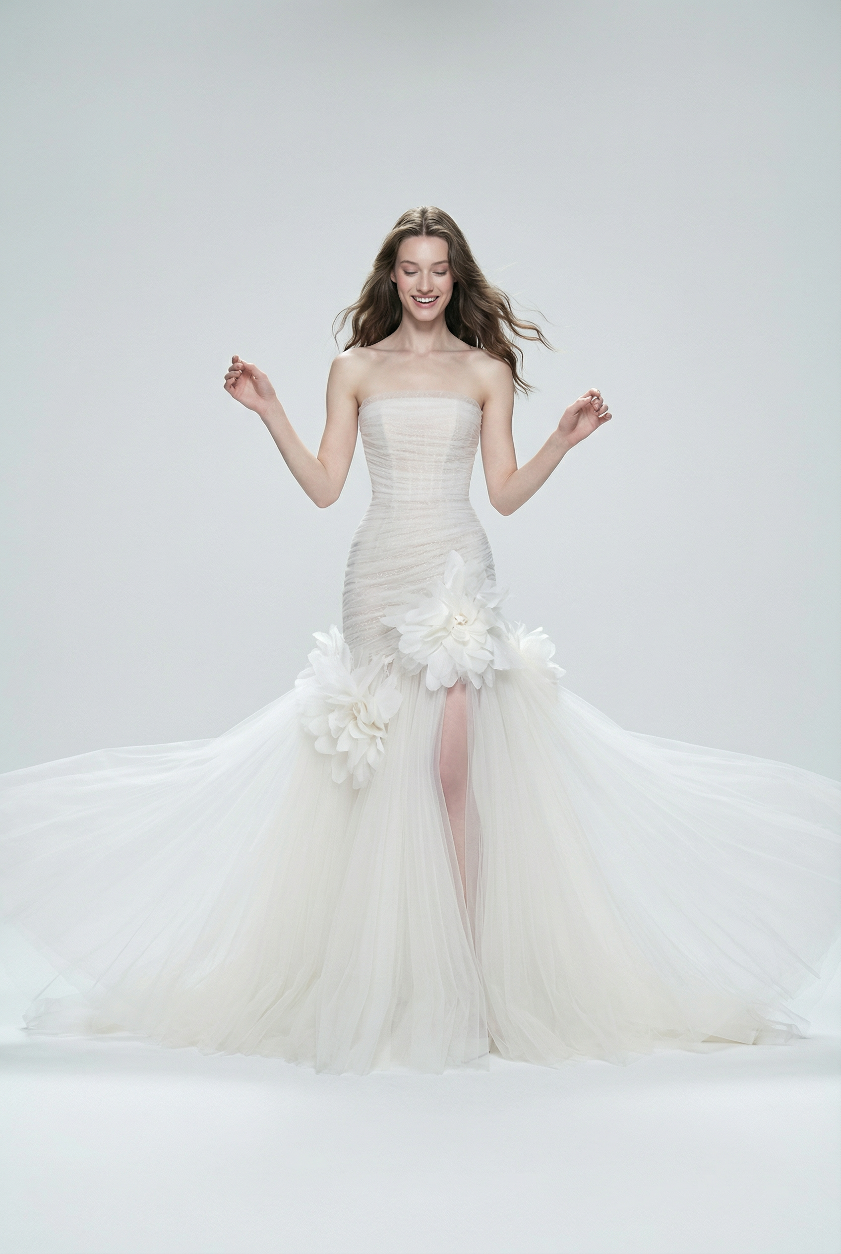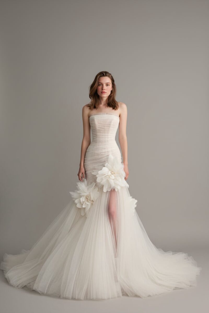 A softly structured strapless bodice shapes the silhouette with refined elegance, finished with delicate horizontal texture. Three-dimensional floral appliqués accent the skirt, opening into a sheer tulle overskirt with a subtle front slit for lightness and movement. A romantic yet modern bridal gown designed for graceful ceremonies and statement entrances.