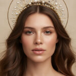 A breathtaking halo crown designed with luminous pearls and sparkling crystals arranged on fine golden wires. This radiant headpiece creates a celestial silhouette, capturing light beautifully from every angle. Ideal for brides, photo shoots, and elegant occasions, it adds a divine and ethereal presence to any look. Lightweight yet striking, it offers both comfort and show-stopping sophistication.