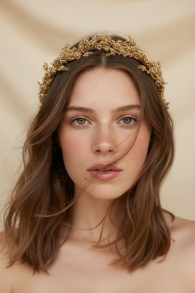 El işçiliğiyle işlenmiş boncuk yaprak motiflerine sahip, vintage esintili altın bir saç aksesuarıdır. Zamansız zarafet ve nostaljik bir ışıltı arayan gelinler için tasarlandı.