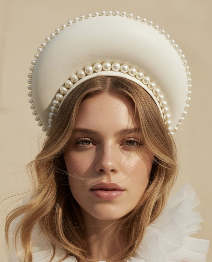 A sculptural headpiece designed with a bold, elevated structure that sits like an artistic stand on the head rather than a traditional hat. Accented with luminous pearls along the edges, it creates a striking frame that blends modern couture with timeless elegance. Lightweight yet impactful, this piece transforms any bridal look into a statement of sophisticated individuality—ideal for brides who want a distinctive, fashion-forward accessory with a clean, architectural aesthetic.